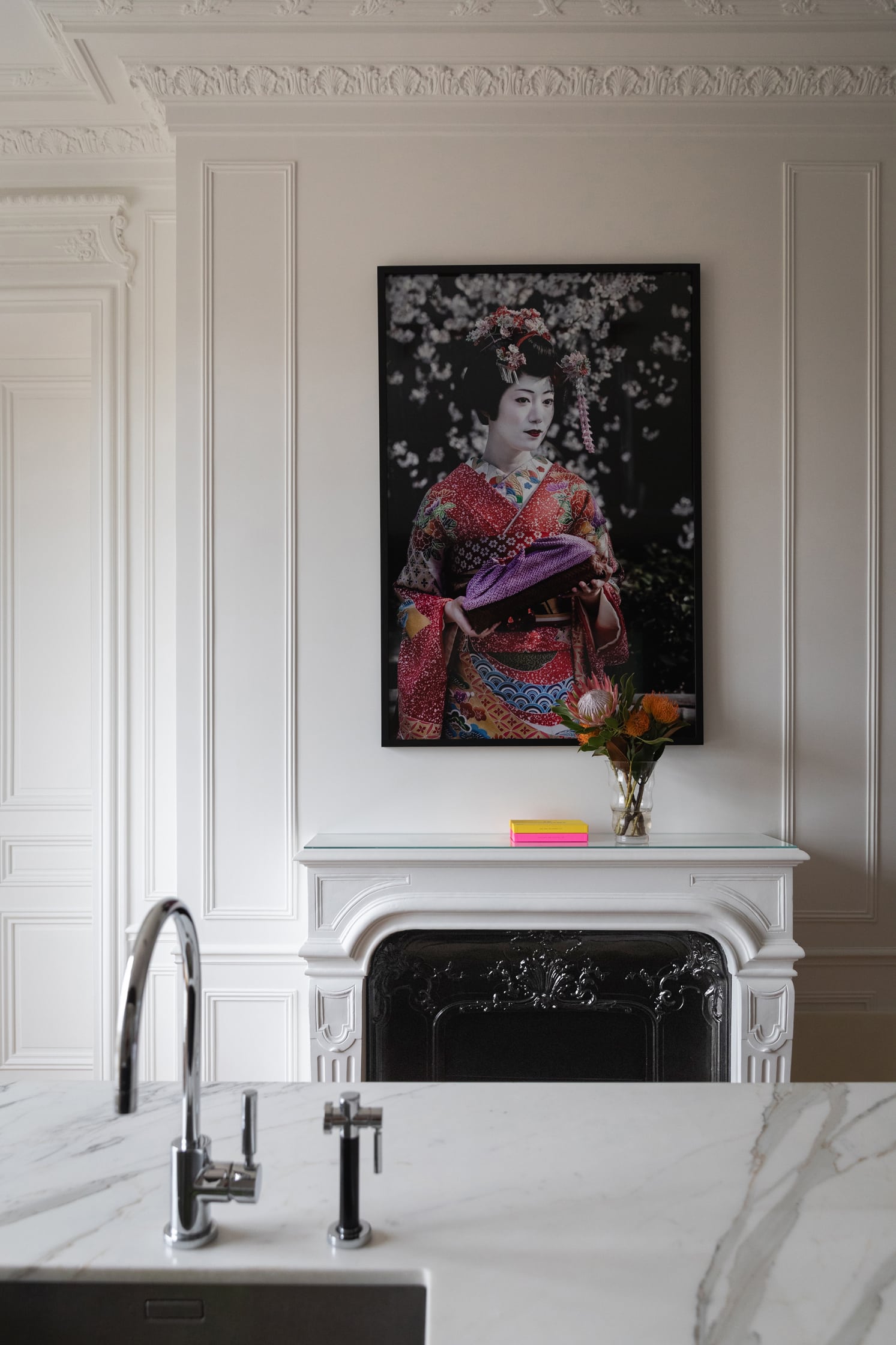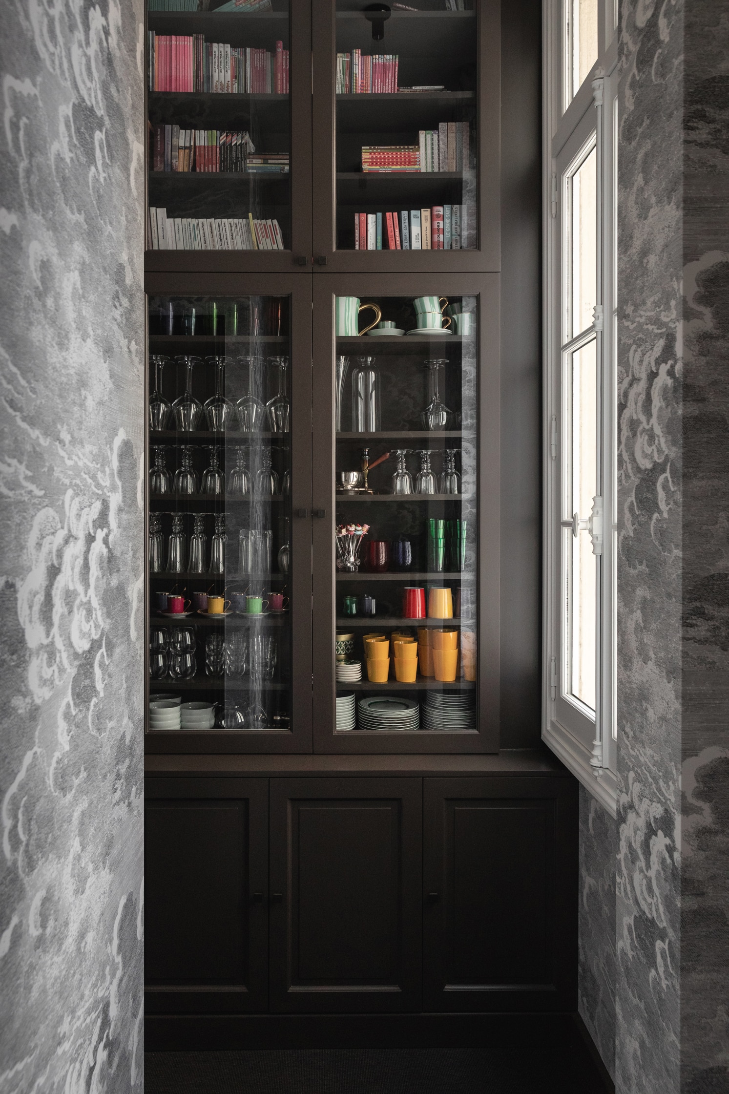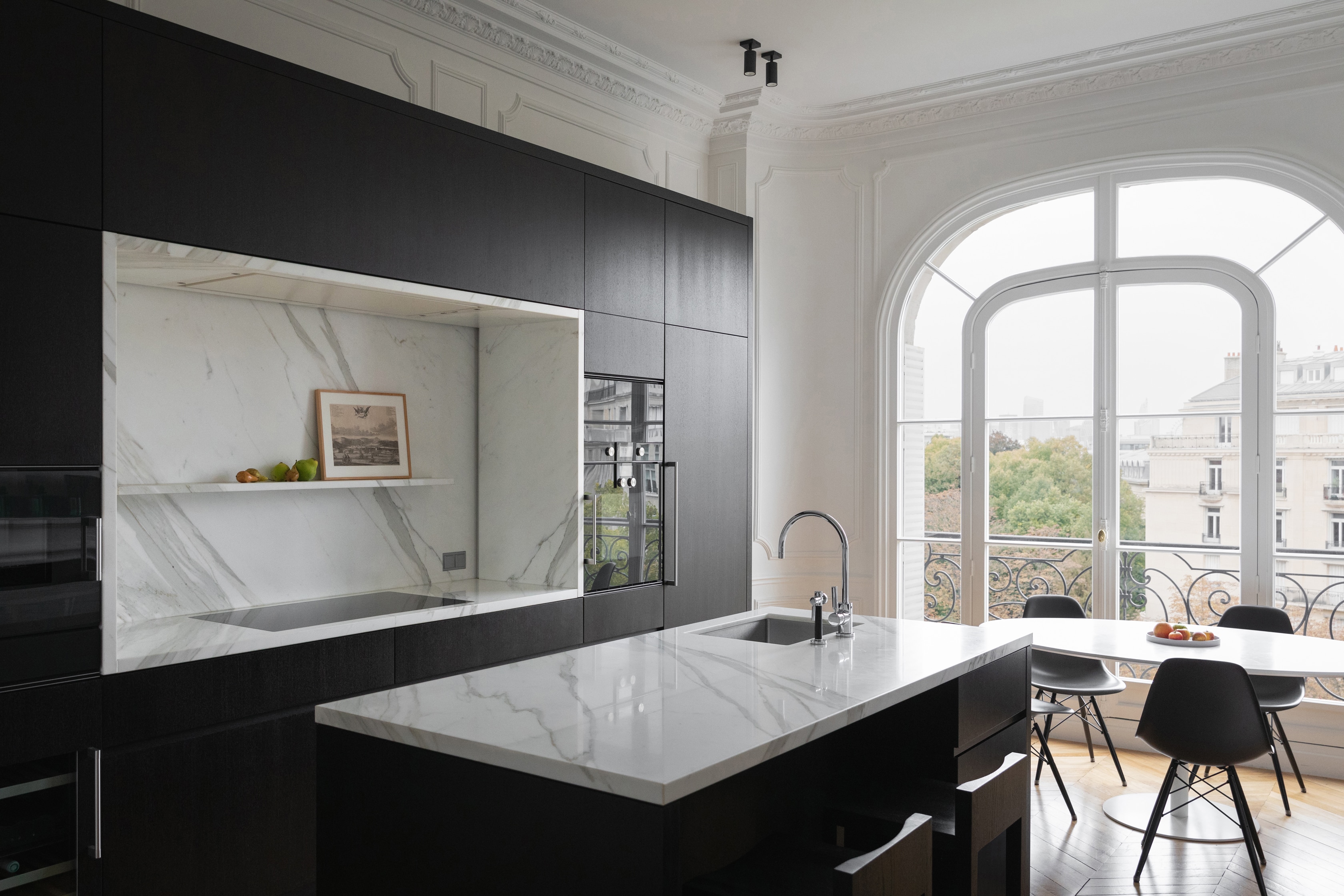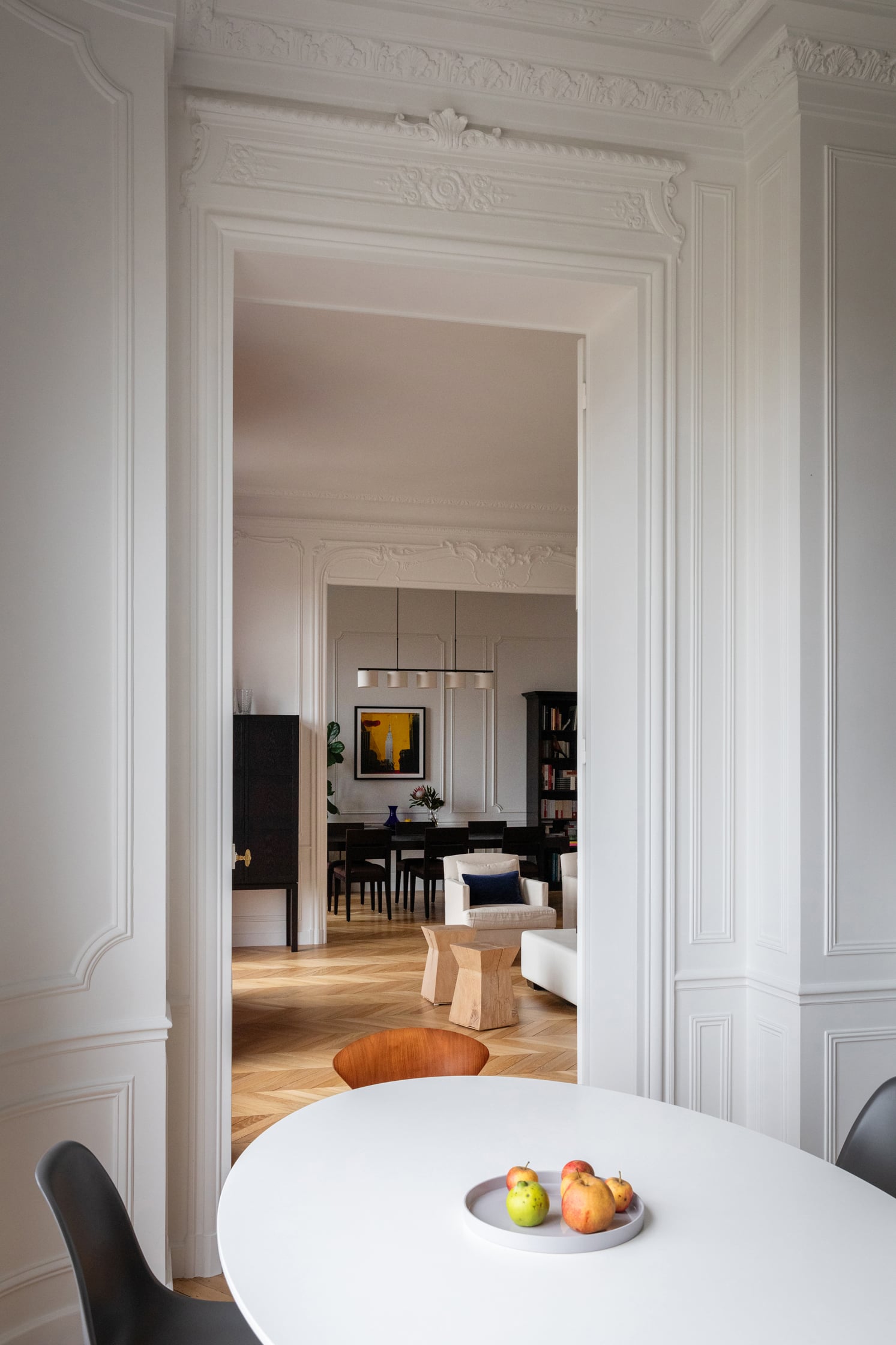 Le réagencement de cet appartement repensé par les architectes a permis au couple de récupérer des espaces perdus afin d’agrandir la salle à manger qui donne sur une cuisine magnifique sublimée par cette porte verrière sur mesure.
